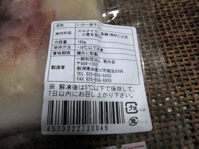 | 原材料名 | するめいか(国産)、魚醤(原材料の一部に小麦・大豆・さけを含む) |