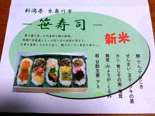 笹すしは、熊笹の葉の上に寿司ご飯を乗せ、具材や薬味を乗せた寿司で、糸魚川市の郷土料理です